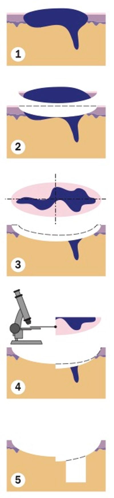 Mohs surgery is a specialized form of skin cancer removal surgery. The goal is to remove all the tumor while saving as much surrounding healthy tissue possible. This minimizes final wound size and leaves the best possible cosmetic result. Skin is removed one stage at a time, while checking the removed pieces under a microscope to evaluate if any skin cancer is remaining. If cancer cells are identified under the microscope, another stage of tissue removal is performed, and the process is repeated. This is done until all the cancer has been removed.